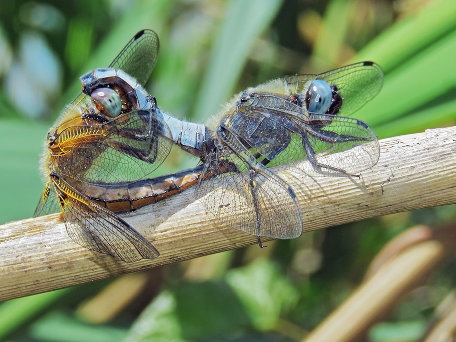 Комментарий. Пара стрекоз плоскобрюхов рыжих (Libellula fulva) на сухом стебле тростника (Phragmites australis) у берега реки Кубань.