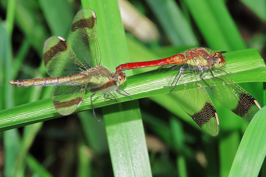 На снимке: пара стрекоз Sympetrum pedemontanum на листе водного растения у самого берега.