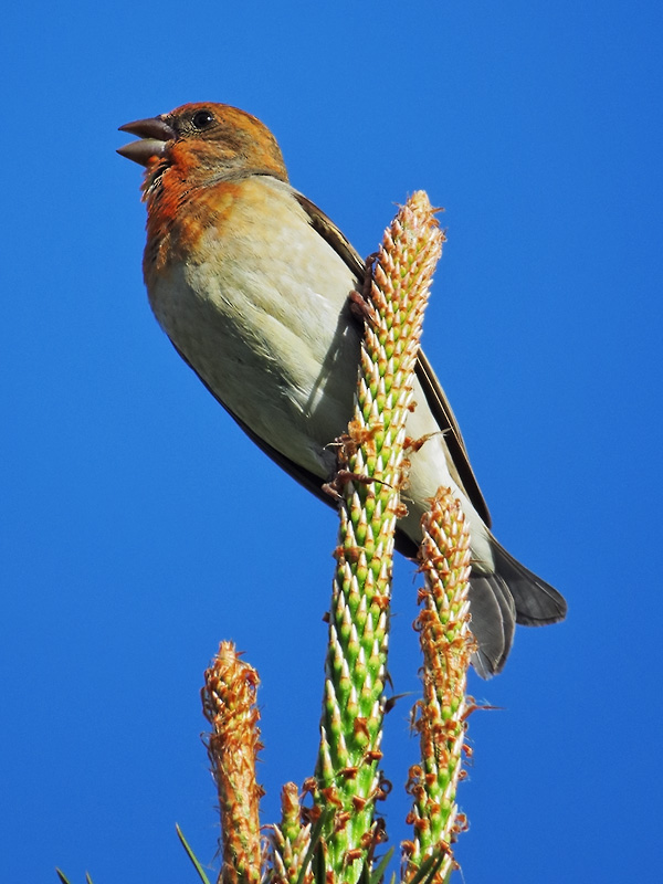 никакого внимания. Размером с воробья, чечевица легко удерживается коготками на тонкой и ещё не одревесневшей верхушке