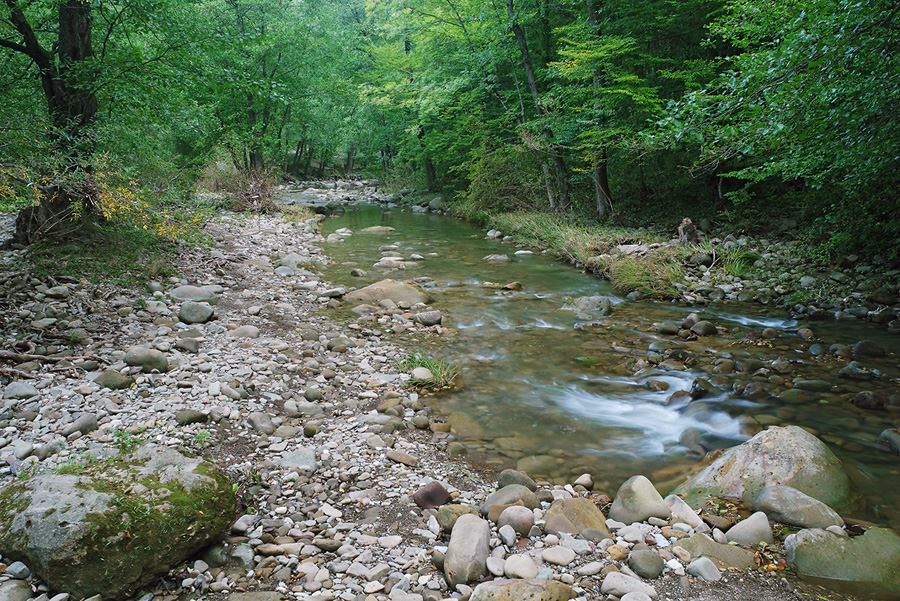 А сейчас, когда в горных лесах стоит сушь, верховья реки мелководны. Лишь многочисленные камни, от гальки до внушительных