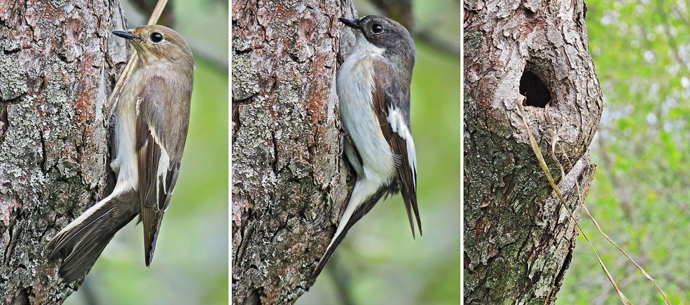 Пара мухоловок-пеструшек (Ficedula hypoleuca) строит гнездо в дупле старой яблони, принося мягкие сухие травинки и укладывая их внутри.