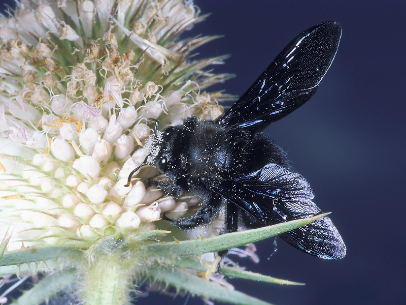 цветочной башни таинственный гость, наверное, кажется драконом... Это пчела-плотник (Xylocopa violacea),