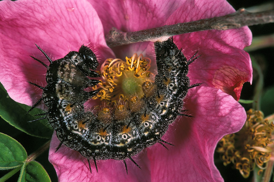 Эта гусеница удобно устроилась на цветке шиповника, готовясь к окукливанию. При помощи особой паутины