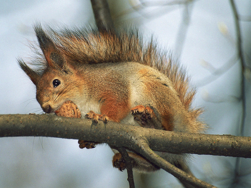 Комментарий. Эта пушистая шалунья ухватила крупную добычу - грецкий орех. Вот только разгрызть его сложновато даже для острых беличьих зубов. Уж больно орех велик, даже во рту не помещается. И что тут делать, как тут быть? Видно придётся Белке звать на помощь Дятла...
