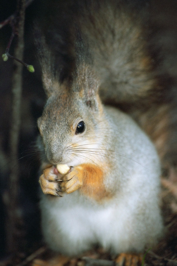 Комментарий. Маленький пушистый бельчонок ловко схватил орешек прямо из рук и тут же рядом уселся завтракать, глядя на нас своими большими, выразительными, почти человеческими глазами. Очень хотелось погладить это милое и доверчивое существо, взять бельчонка на руки, принести к себе домой. Но Пушистик бы такого проявления любви не одобрил. Мол, за угощение спасибо, но я вам не домашний питомец, я существо независимое...