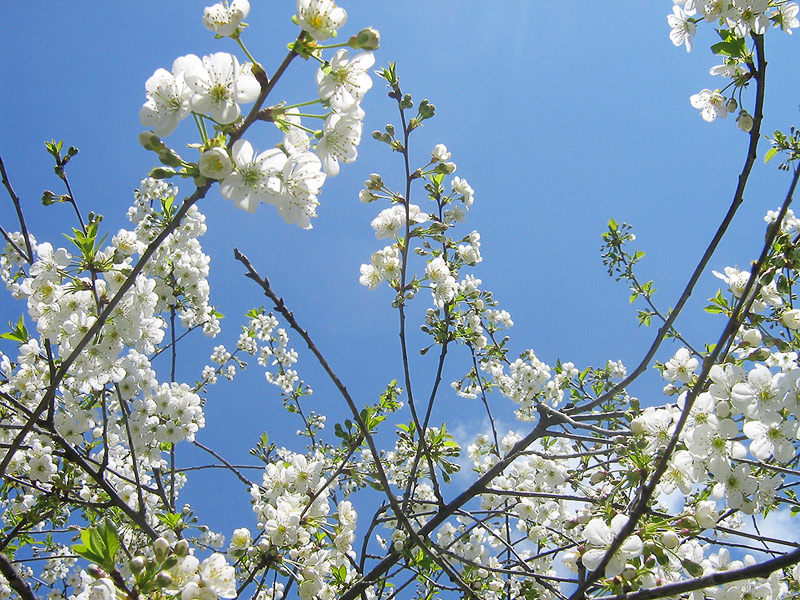 Комментарий. Цветущее дерево вишни (Prunus cerasus) в ясный солнечный день.