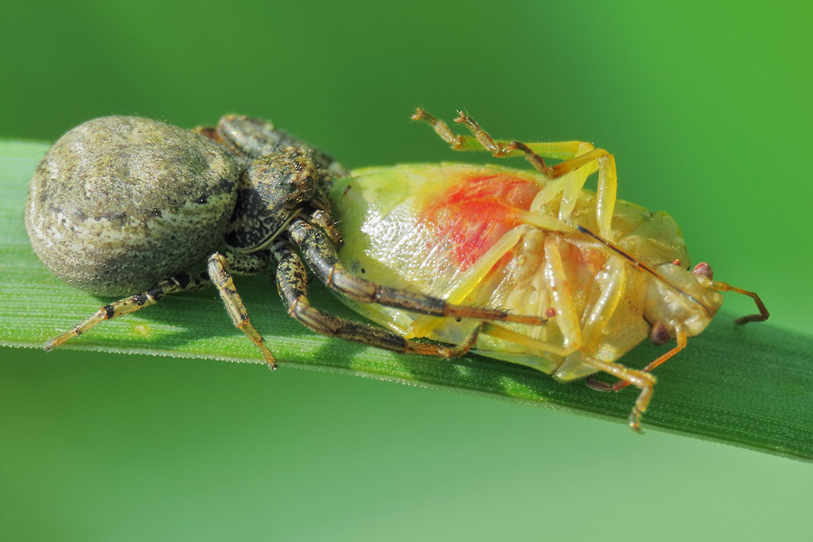 Комментарий. Паук-краб Xysticus sp. из семейства Thomisidae, поймавший клопа-щитника.