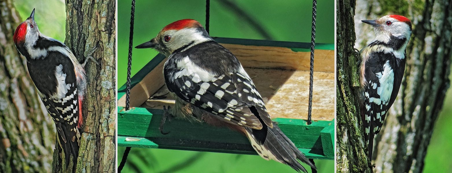 В один прекрасный день мне довелось заметить, что кормушку посетил редкий гость - средний пёстрый дятел (Dendrocopos medius). Он похож на большого пёстрого дятла, но несколько меньше размером, более короткоклювый и с почти полностью белыми щеками, на которых почти не выражены чёрные "усы".