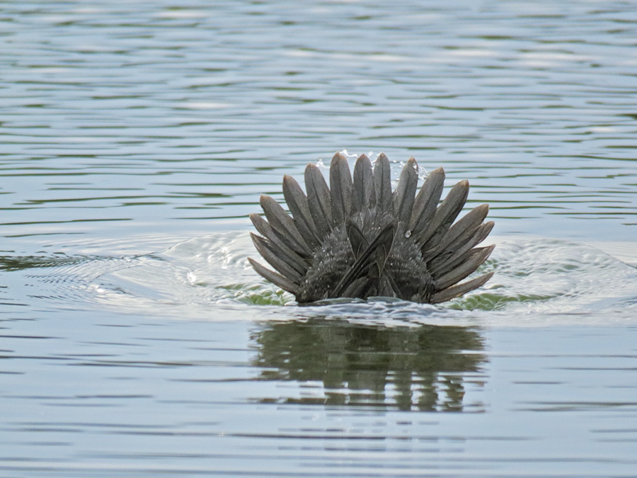 ныряльщица вдруг стремительно переворачивалась головою вниз и под наклоном уходила в глубину, растопырив веером хвост,