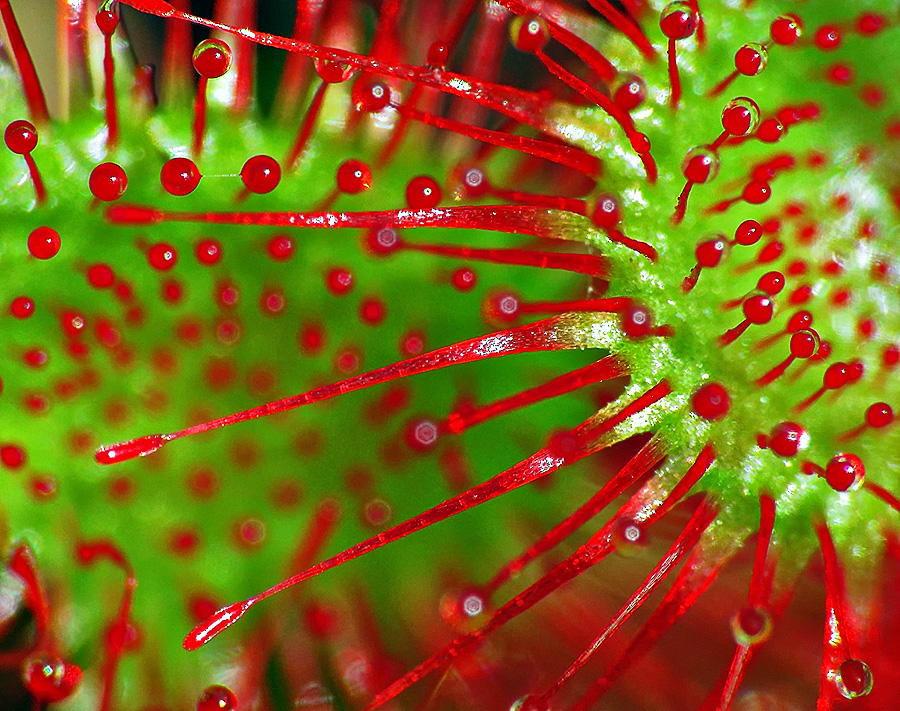 Снова, через много лет, я вернулся на небольшое, но весьма своеобразное моховое болото, что находится на северной окраине озера Глубокого. Главный интерес для меня представляли, конечно же, росянки круглолистные (Drocera rotundifolia), растущие здесь в во влажных объятиях сфагнума. Но в этот раз мне хотелось чего-то особенного: яркого, экспрессивного, фантастического. Я решил воспользоваться макроконвертером Raynox DCR-250, позволяющим получить очень большое увеличение. Экспериментируя с масштабом, ракурсом, освещением, в конце концов, пришёл к выводу, что вечерний свет ясного солнца - тёплый и низкий, наиболее соответствует задуманному: он придаёт картине особую тональность, усиливая цветовые контрасты между хризолитовым зелёным и рубиновым красным.