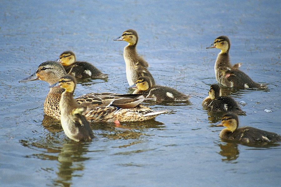 вдруг отстали или есть повод для беспокойства, утка-мать строгим призывным кряком зовёт их к себе.