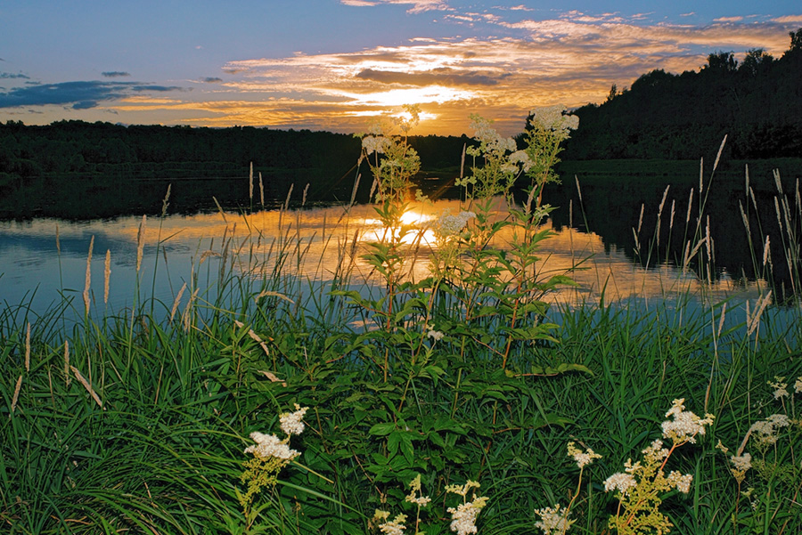 Ещё один, скромный, но милый закат у нас на Лебедянском пруду, вдоль берегов которого поднялись высокие и сочные травы -
