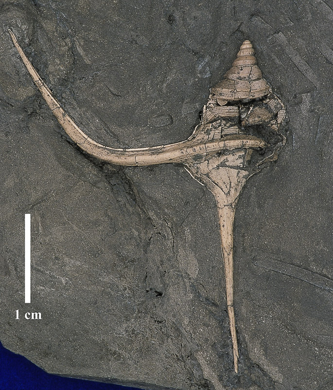 Размеры. Высота раковины (вместе с устьевыми отростками) около 37 мм. Длина масштабного отрезка равна 1 см.