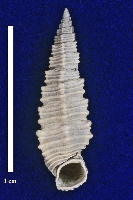 Комментарий. Типичная (пятигранная) форма. Раковина с сохранившимися протоконхом и устьем. Вид со стороны устья.