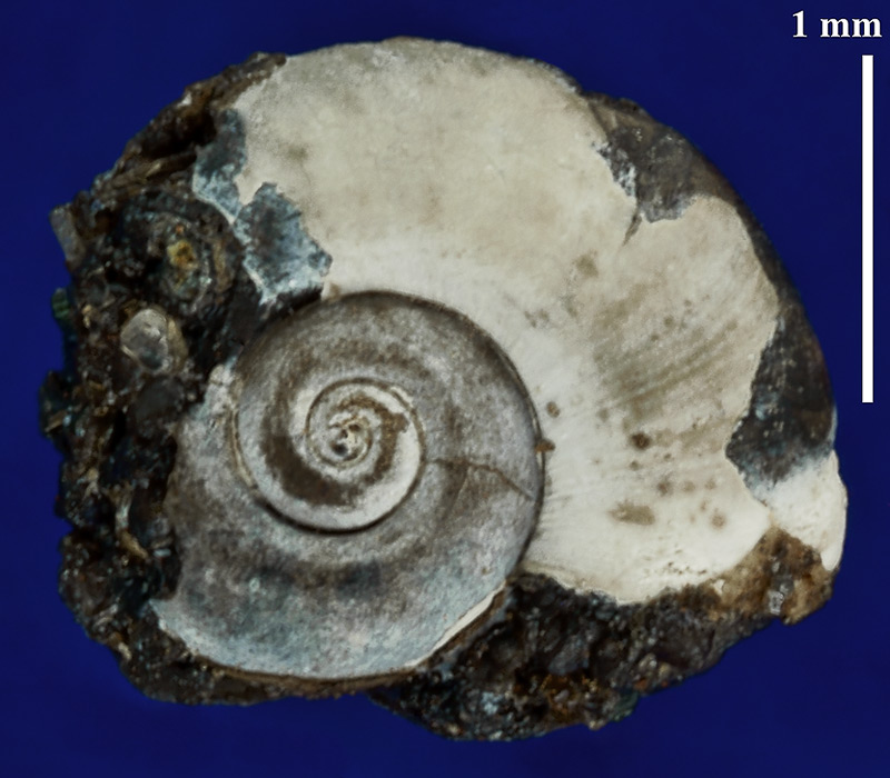 Размеры. Максимальный диаметр раковины- около 2,5 мм. Длина масштабного отрезка равна 1 мм.