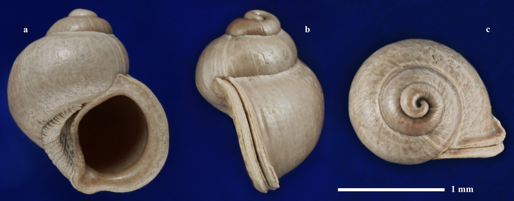 Комментарий. Полностью сохранившаяся раковина взрослой особи. a - вид со стороны устья; b - вид сбоку от устья; c - вид сверху.