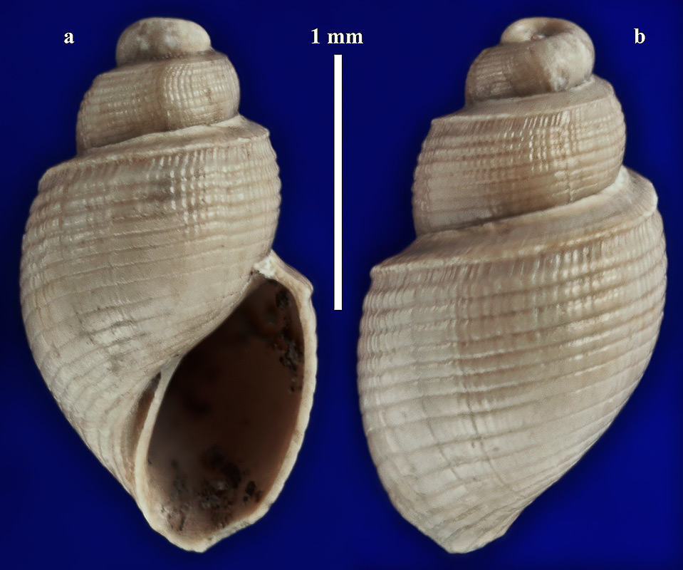 Размеры. Высота раковины около 2,1 мм. Длина масштабного отрезка равна 1 мм.