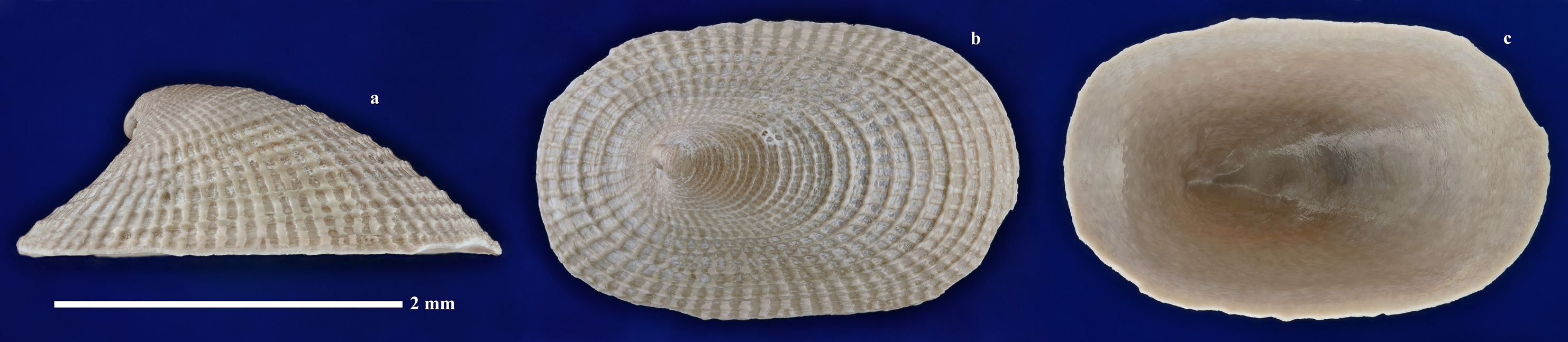 Комментарий. Раковина взрослой особи с сохранившимся протоконхом. a - вид сбоку; b - вид сверху; c - вид снизу (с внутренней стороны).