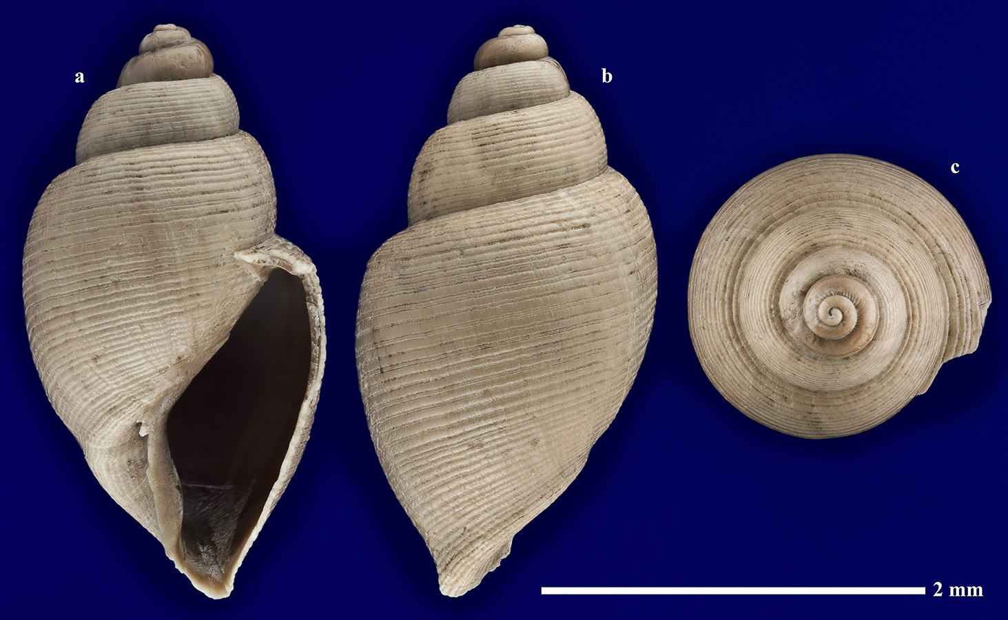 Комментарий. Раковина с сохранившимся протоконхом и частично сохранившимся устьем. a - вид со стороны устья; b - вид со стороны, противоположной устью; c - вид сверху.