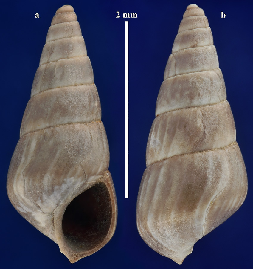 Комментарий. Раковина взрослой особи с сохранившимся протоконхом и частично сохранившимся устьем. a - вид со стороны устья; b - вид со стороны, противоположной устью.