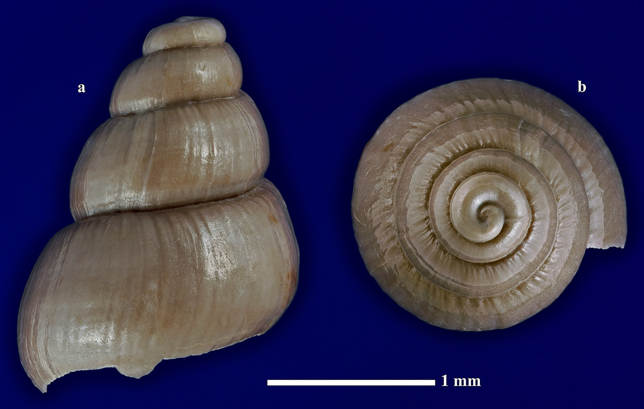 Комментарий. Начальные обороты раковины. a - вид сбоку; b - вид сверху.