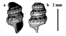 Фрагмент раковины. a - вид со стороны устья; b - вид со стороны, противоположной устью.