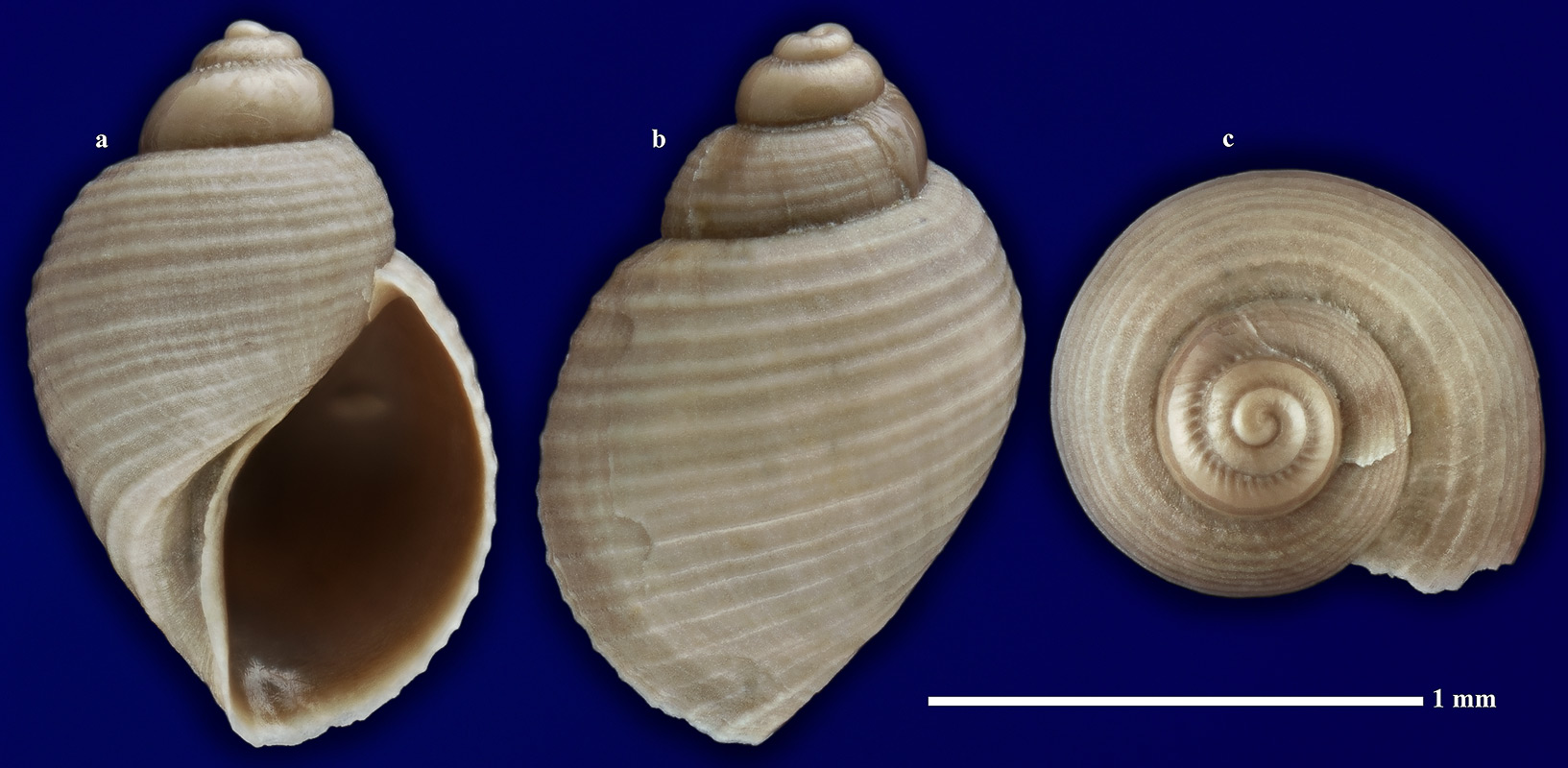 Комментарий. Раковина взрослой (?) особи с сохранившимися протоконхом и устьем. a - вид со стороны устья; b - вид со стороны, противоположной устью; c - вид сверху.
