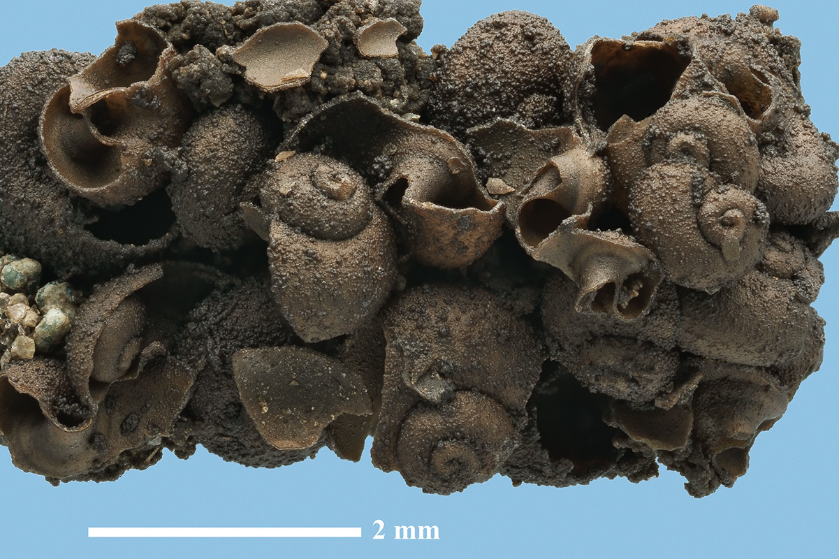 Размеры. Максимальный диаметр раковины (слева вверху) около 1,8 мм. Длина масштабного отрезка равна 2 мм.