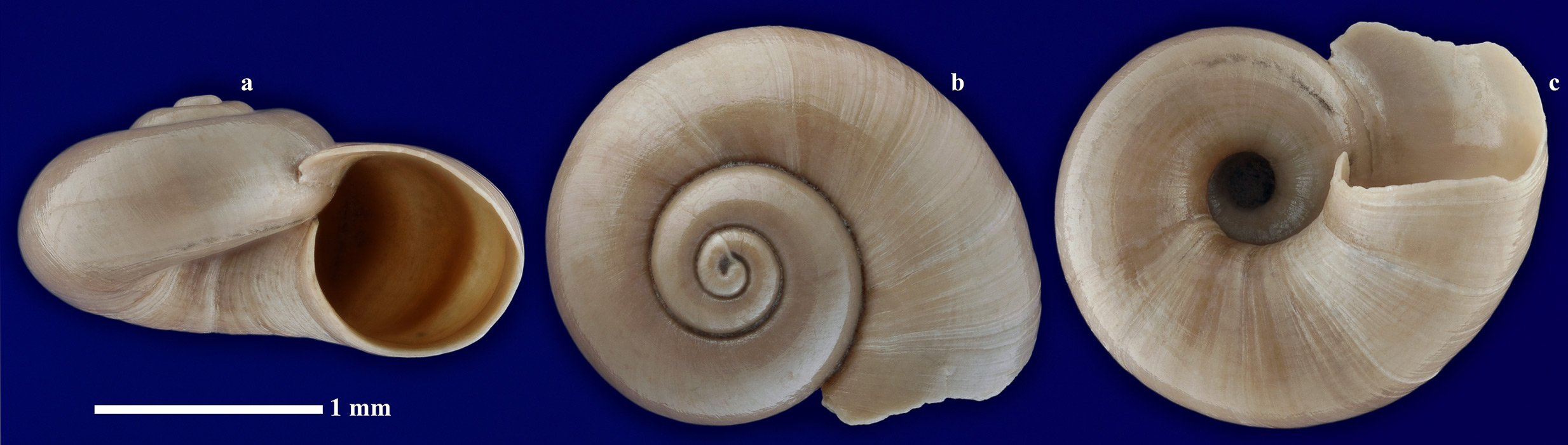 Размеры. Максимальный диаметр раковины около 2,2 мм. Длина масштабного отрезка равна 1 мм.