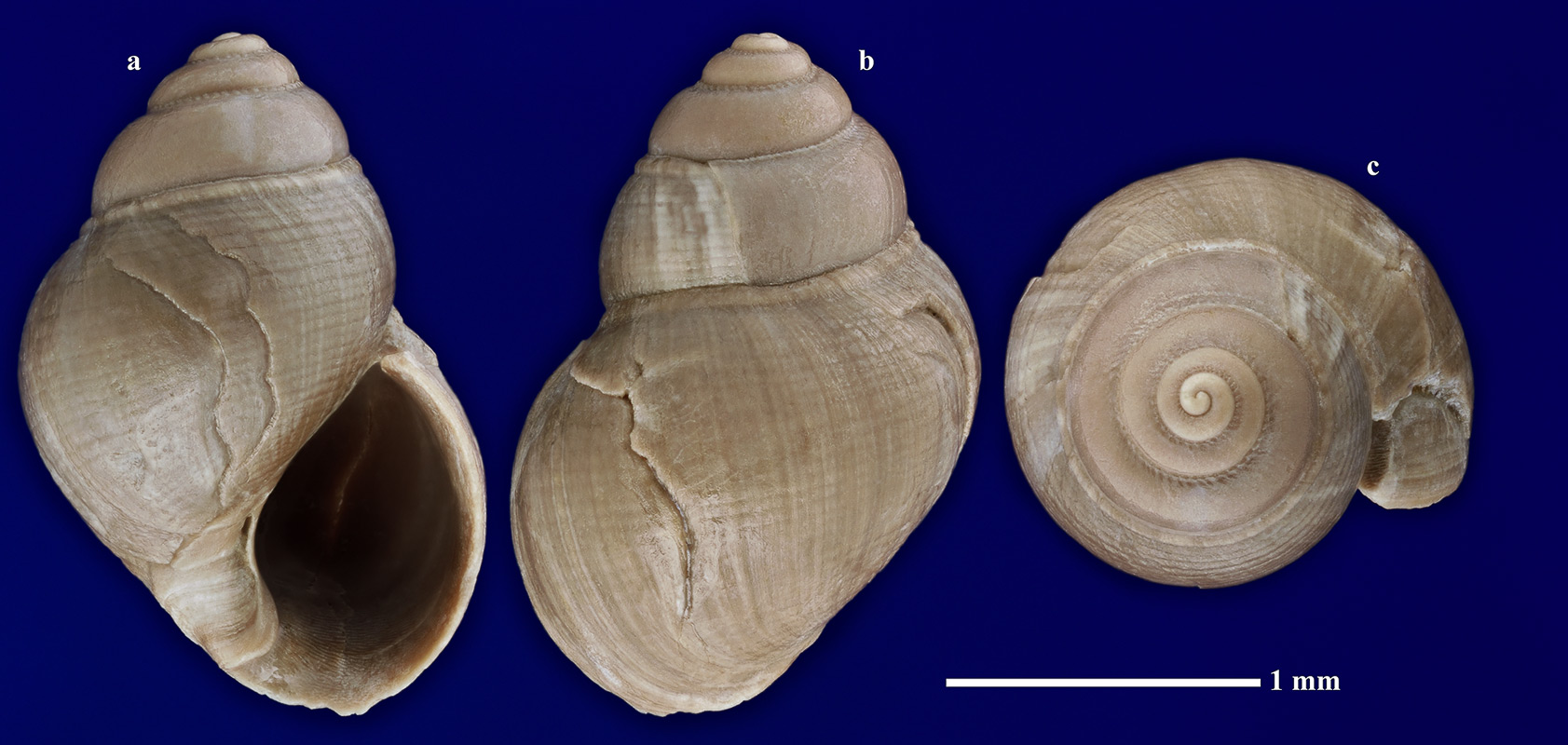 Комментарий. Раковина взрослой особи с сохранившимися протоконхом и устьем. a - вид со стороны устья; b - вид со стороны, противоположной устью; c - вид сверху.