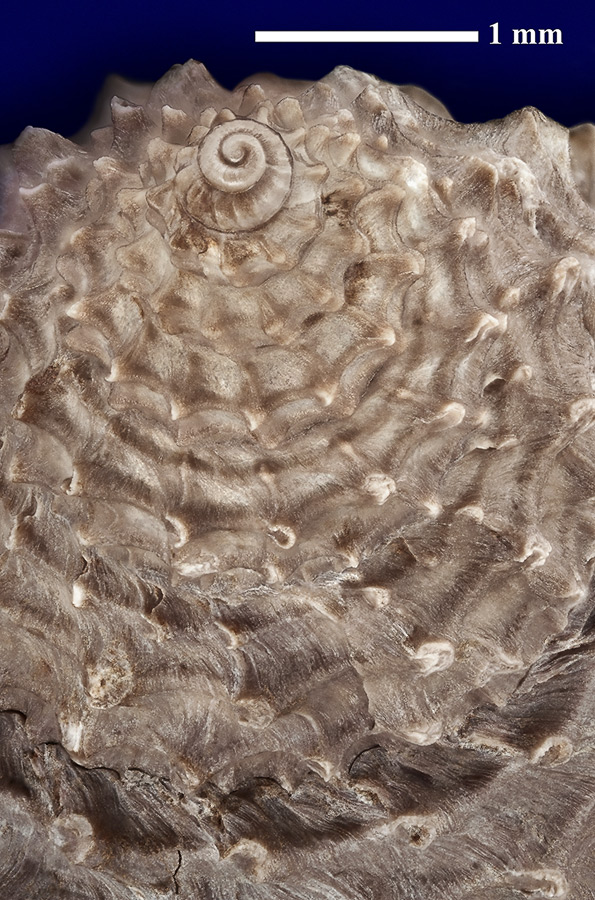 Раковина молодой особи с сохранившимся протоконхом и частично сохранившимся устьем.