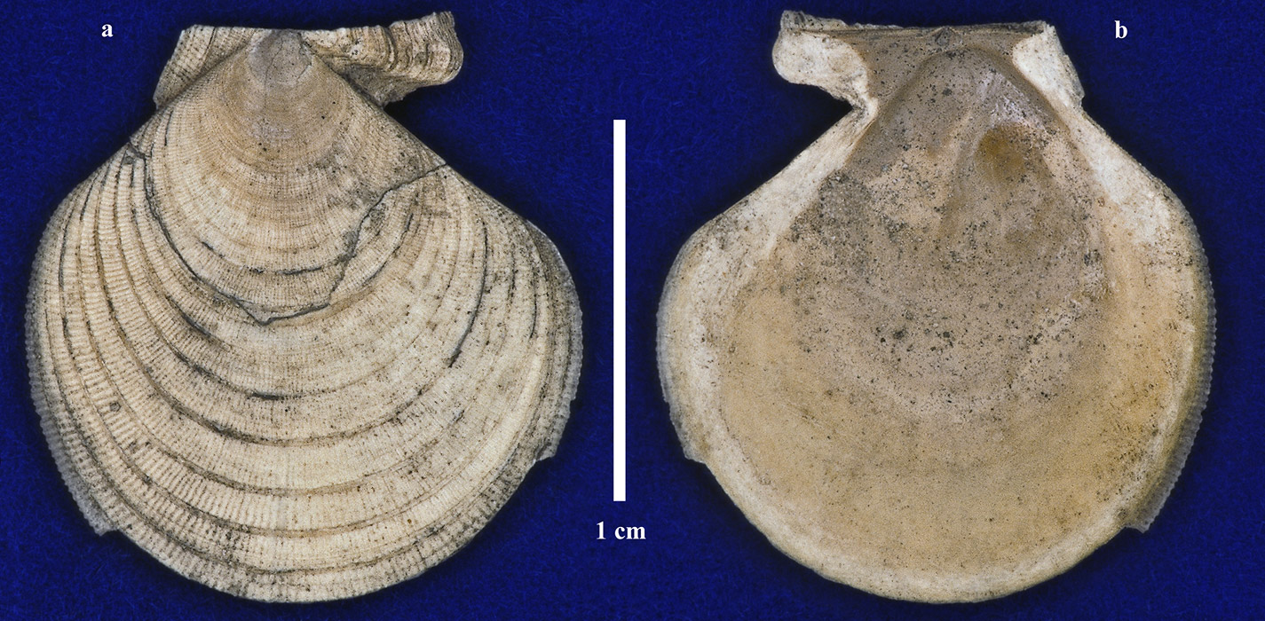 Правая створка раковины молодой особи. a - вид с наружной стороны; b - вид с внутренней стороны.