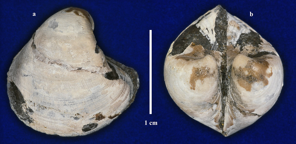 Внутреннее ядро с частично сохранившейся раковиной. a - вид со стороны правой створки; b - вид сверху.