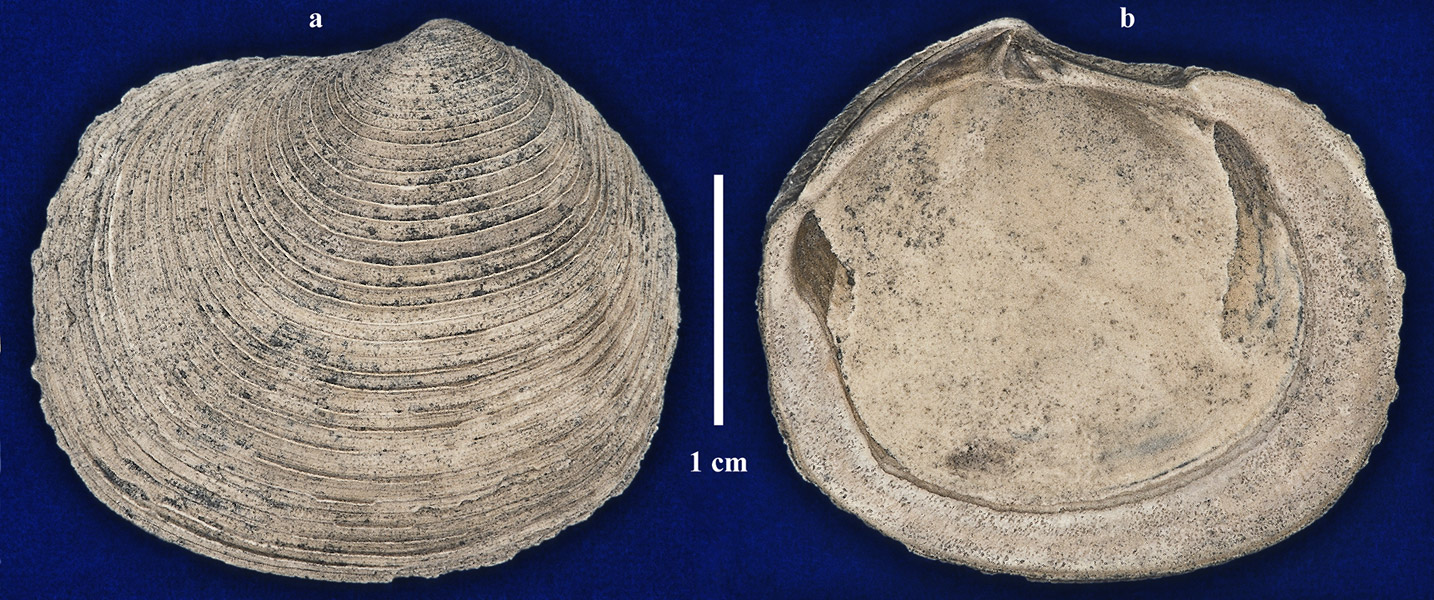 Левая створка раковины. a - вид с наружной стороны; b - вид с внутренней стороны.