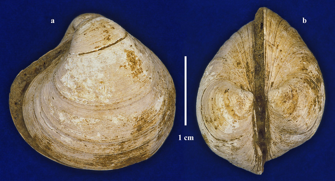 Раковина с немного смещёнными створками. a - вид со стороны левой створки; b - вид сверху.