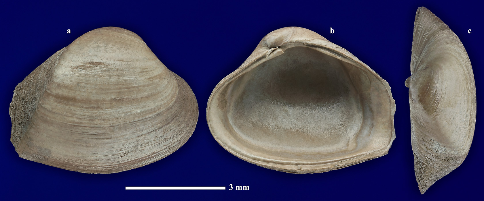 Правая створка раковины. a - вид с наружной стороны; b - вид с внутренней стороны; c - вид сверху.