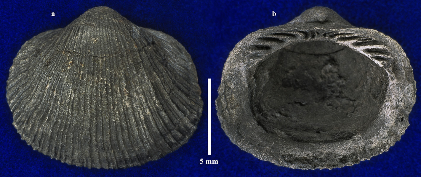 Правая створка раковины молодой особи. a - вид с наружной стороны; b - вид с внутренней стороны.