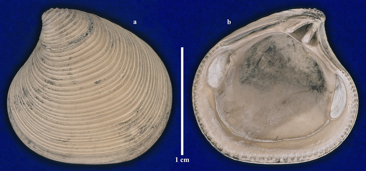 Левая створка раковины. a - вид с наружной стороны; b - вид с внутренней стороны.
