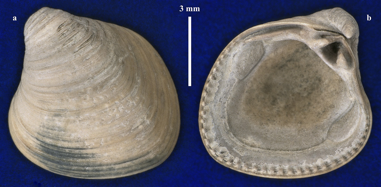 Левая створка раковины. a - вид с наружной стороны; b - вид с внутренней стороны.