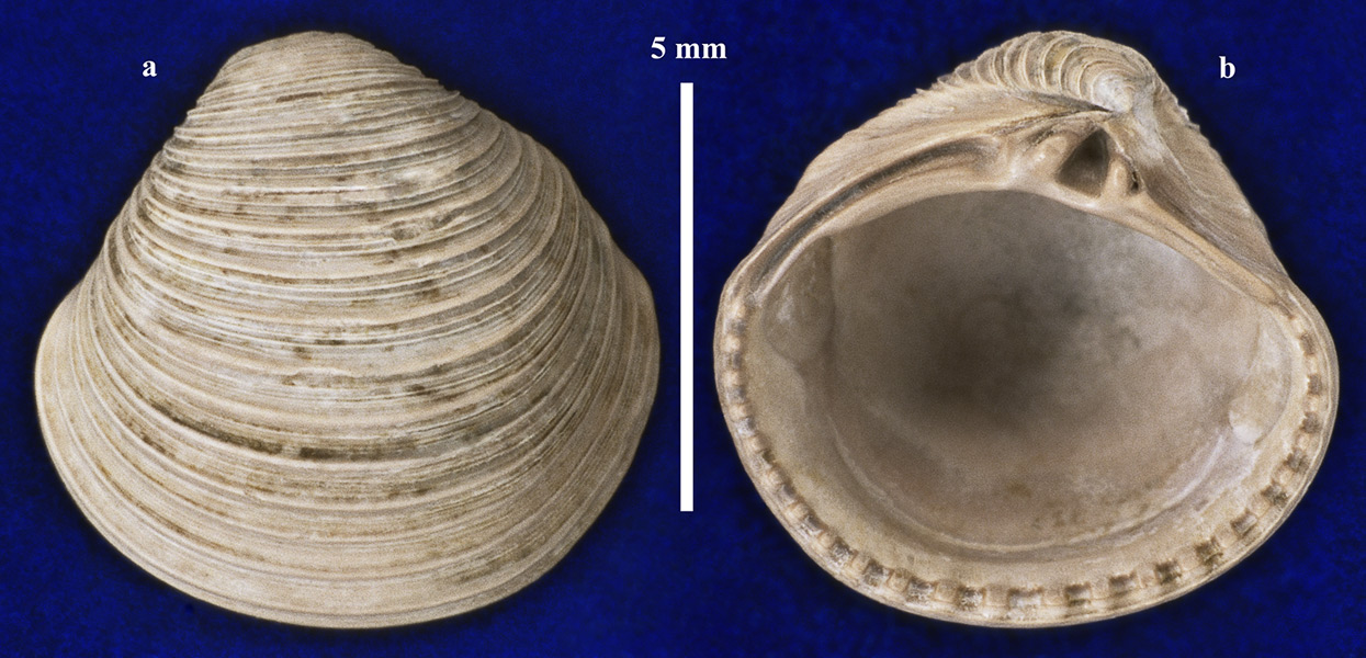Левая створка раковины. a - вид с наружной стороны; b - вид с внутренней стороны.