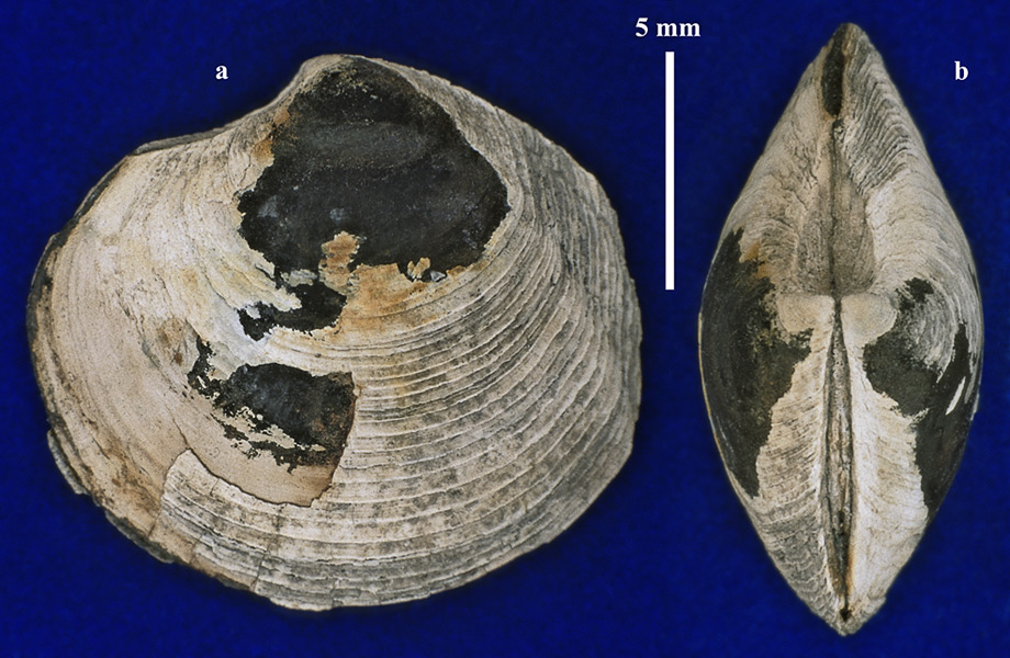 Раковина молодой особи с частично сохранившимся поверхностным слоем.