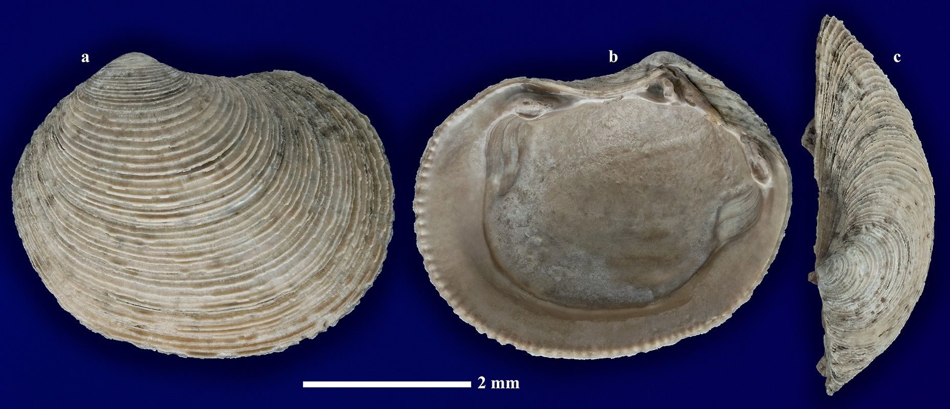 Правая створка раковины. a - вид с наружной стороны; b - вид с внутренней стороны; c - вид сверху.