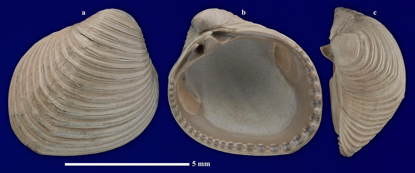 Правая створка раковины. a - вид с наружной стороны; b - вид с внутренней стороны; c - вид сверху.