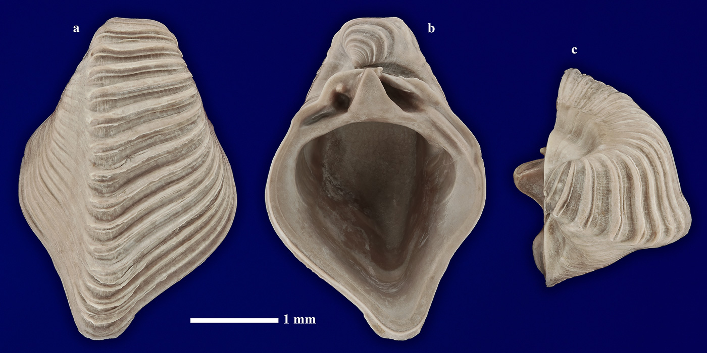 Правая створка раковины ювенильной особи. a - вид с наружной стороны; b - вид с внутренней стороны; c - вид сверху.