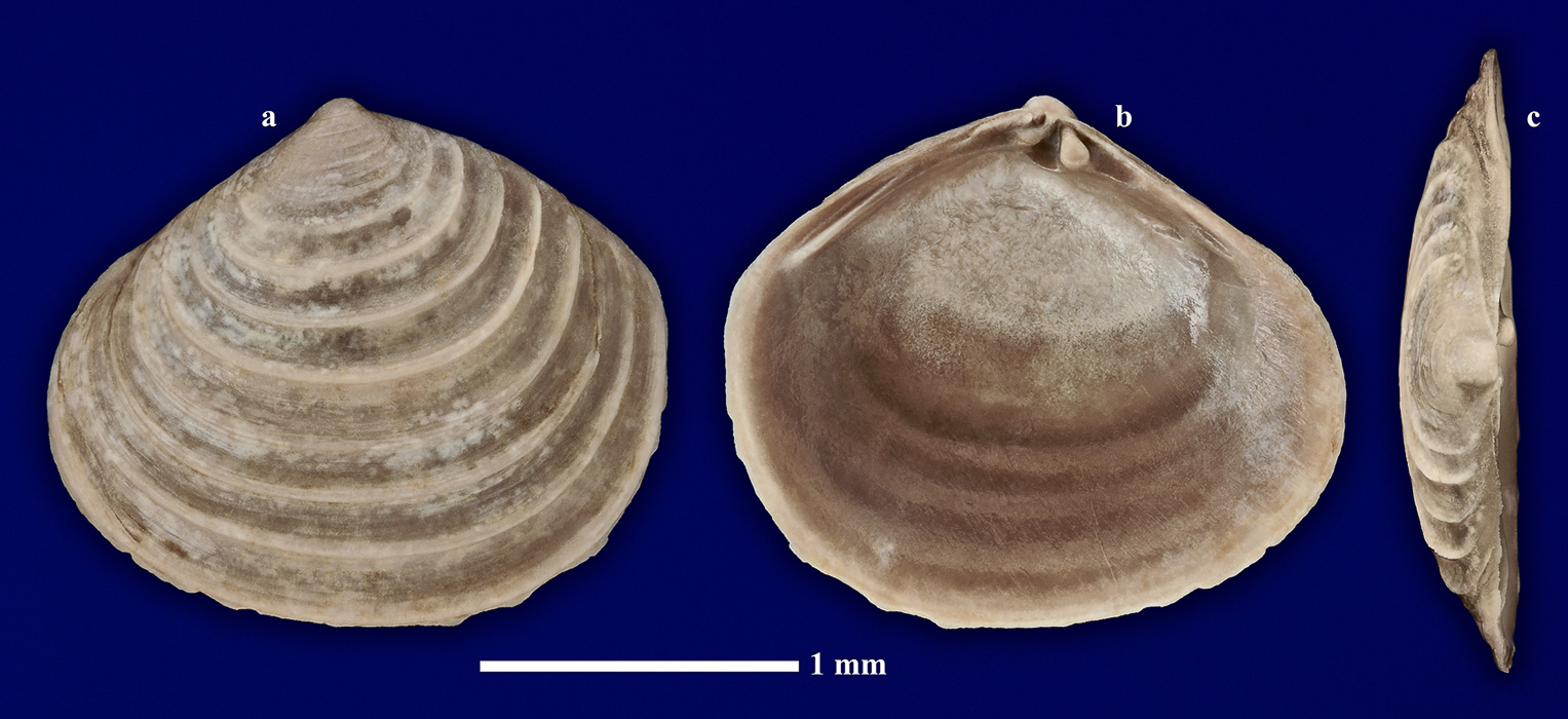 Левая створка раковины ювенильной особи. a - вид с наружной стороны; b - вид с внутренней стороны; c - вид сверху.