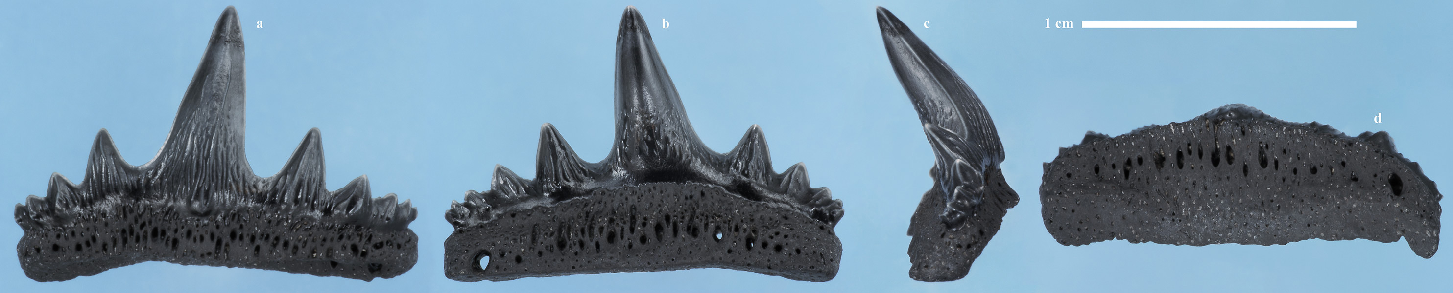 Комментарий. Передне-боковой нижнечелюстной (?) зуб. a - вид спереди; b - вид сзади; c - вид сбоку; d - вид снизу.