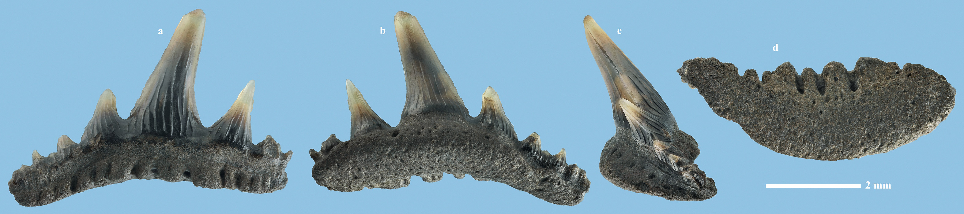 Комментарий. Боковой нижнечелюстной (?) зуб. a - вид спереди; b - вид сзади; c - вид сбоку; d - вид снизу.