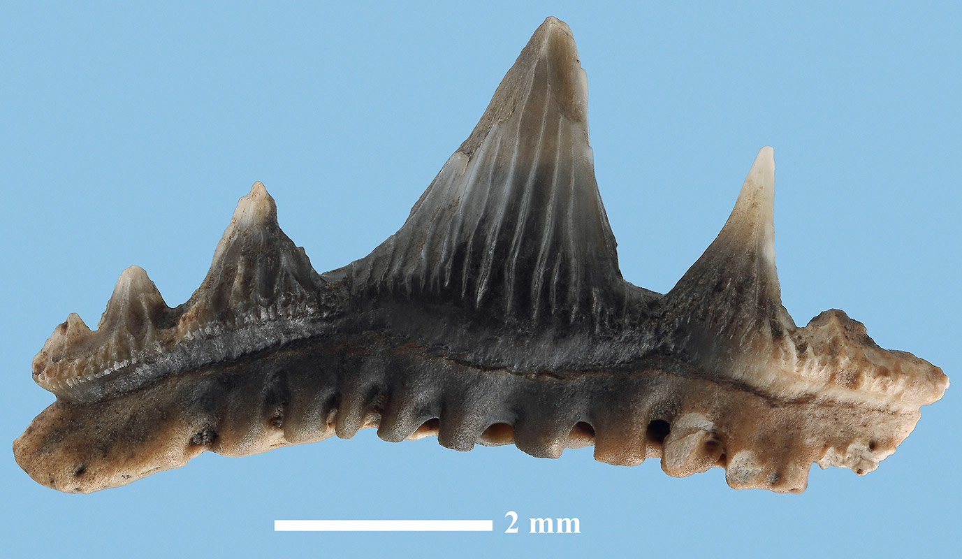 Комментарий. Известа единственная находка данной формы - частично сохранившийся передне-боковой зуб. Вид спереди.