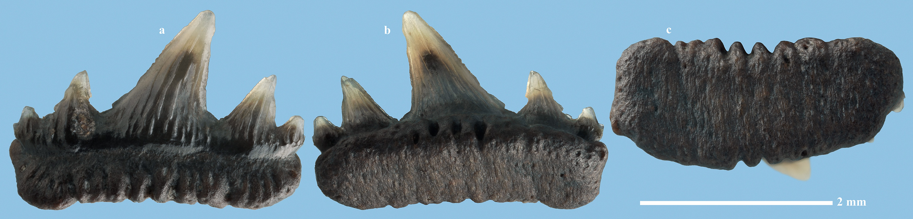 Комментарий. Задне-боковой верхнечелюстной (?) зуб. a - вид спереди; b - вид сзади; c - вид снизу.