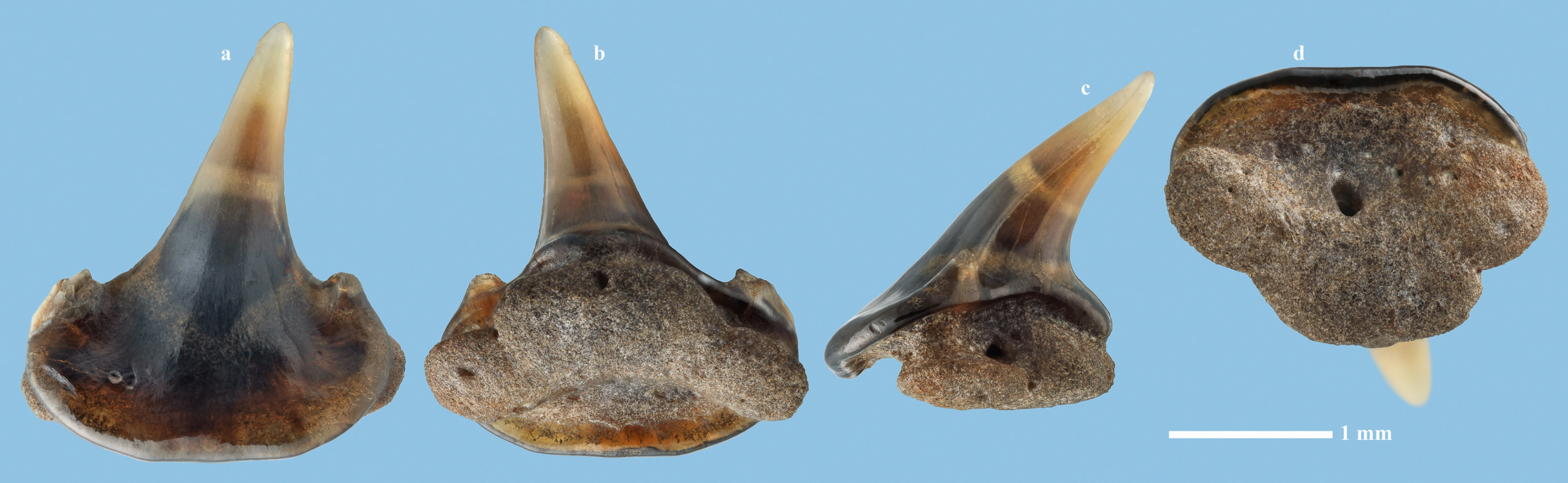 Комментарий. Боковой зуб. a - вид спереди; b - вид сзади; c - вид сбоку; d - вид снизу.